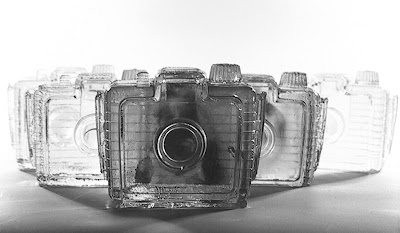A mold of a Kodak Brownie camera was made and cast with resin. During the cure, some of the cameras had reprinted childhood photographs inserted where the film plane would be on the actual camera.